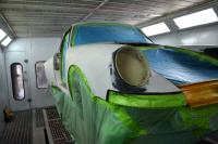 Nach dem auftragen der 2 K Grundierung wird die Karosserie ganz dünn schwarz glänzend lackiert um noch kleine Beulen oder Dellen sichtbar zu machen.